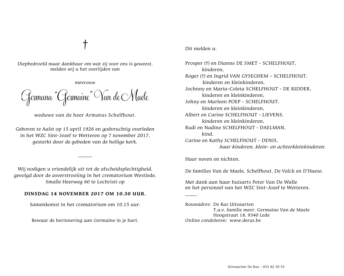 Overleden te Wetteren (9230) op dinsdag 7 november 2017 op 91-jarige leeftijd