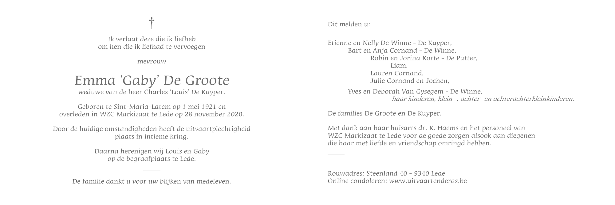 Overleden te Lede (9340) op zaterdag 28 november 2020 op 99-jarige leeftijd