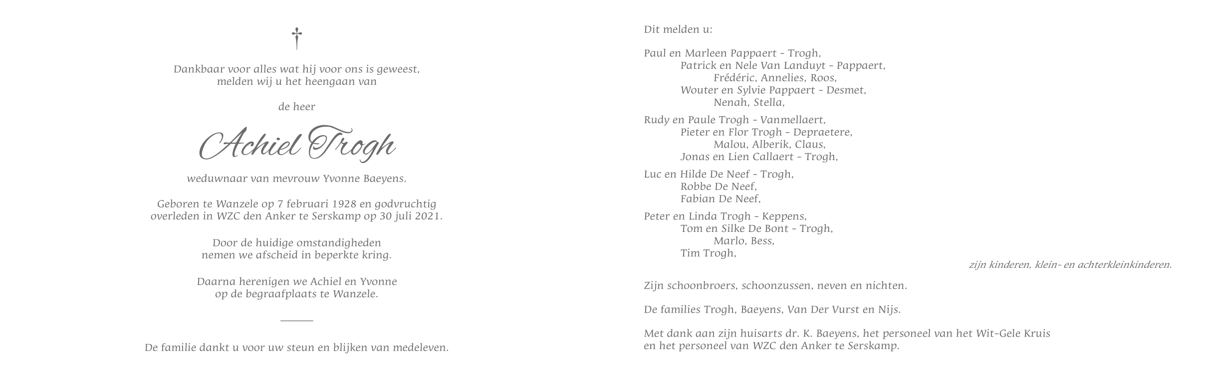 Overleden te Serskamp (9260) op vrijdag 30 juli 2021 op 93-jarige leeftijd
