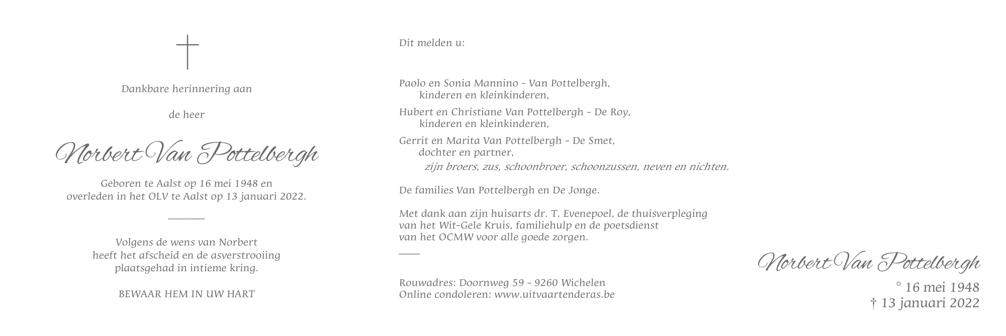 Overleden te Aalst (9300) op donderdag 13 januari 2022 op 73-jarige leeftijd