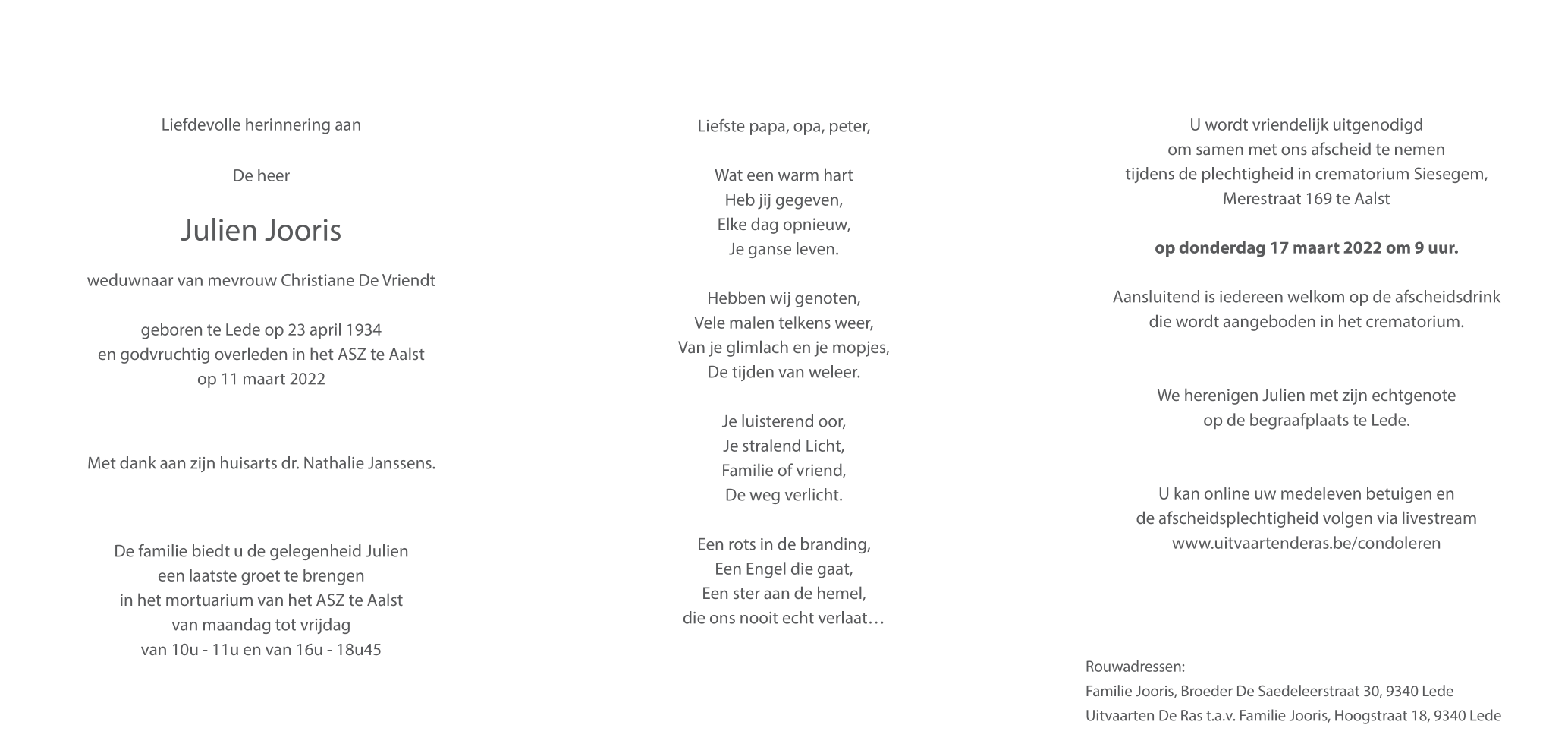 Overleden te Aalst (9300) op vrijdag 11 maart 2022 op 87-jarige leeftijd