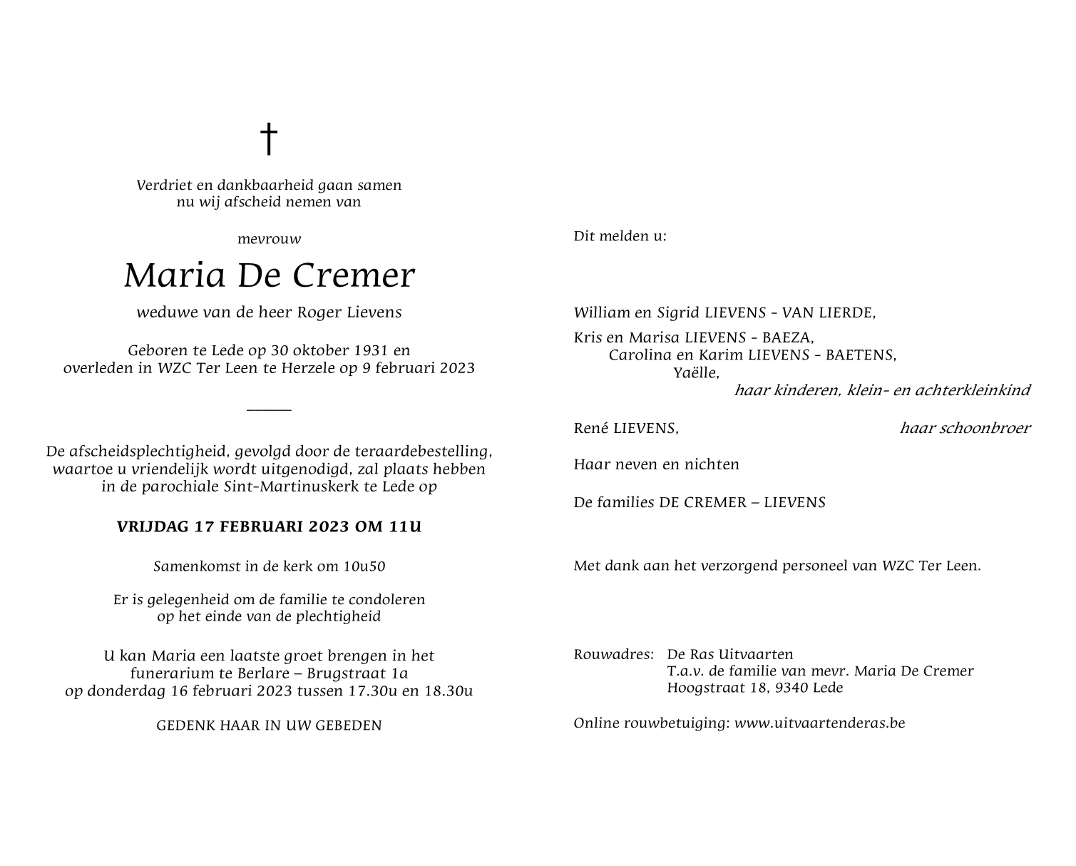 Overleden te Herzele (9550) op donderdag 9 februari 2023 op 91-jarige leeftijd