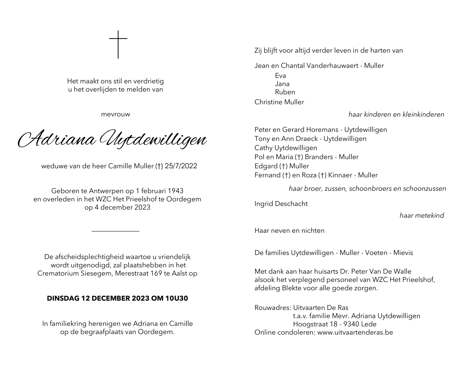 Overleden te Oordegem (9340) op maandag 4 december 2023 op 80-jarige leeftijd