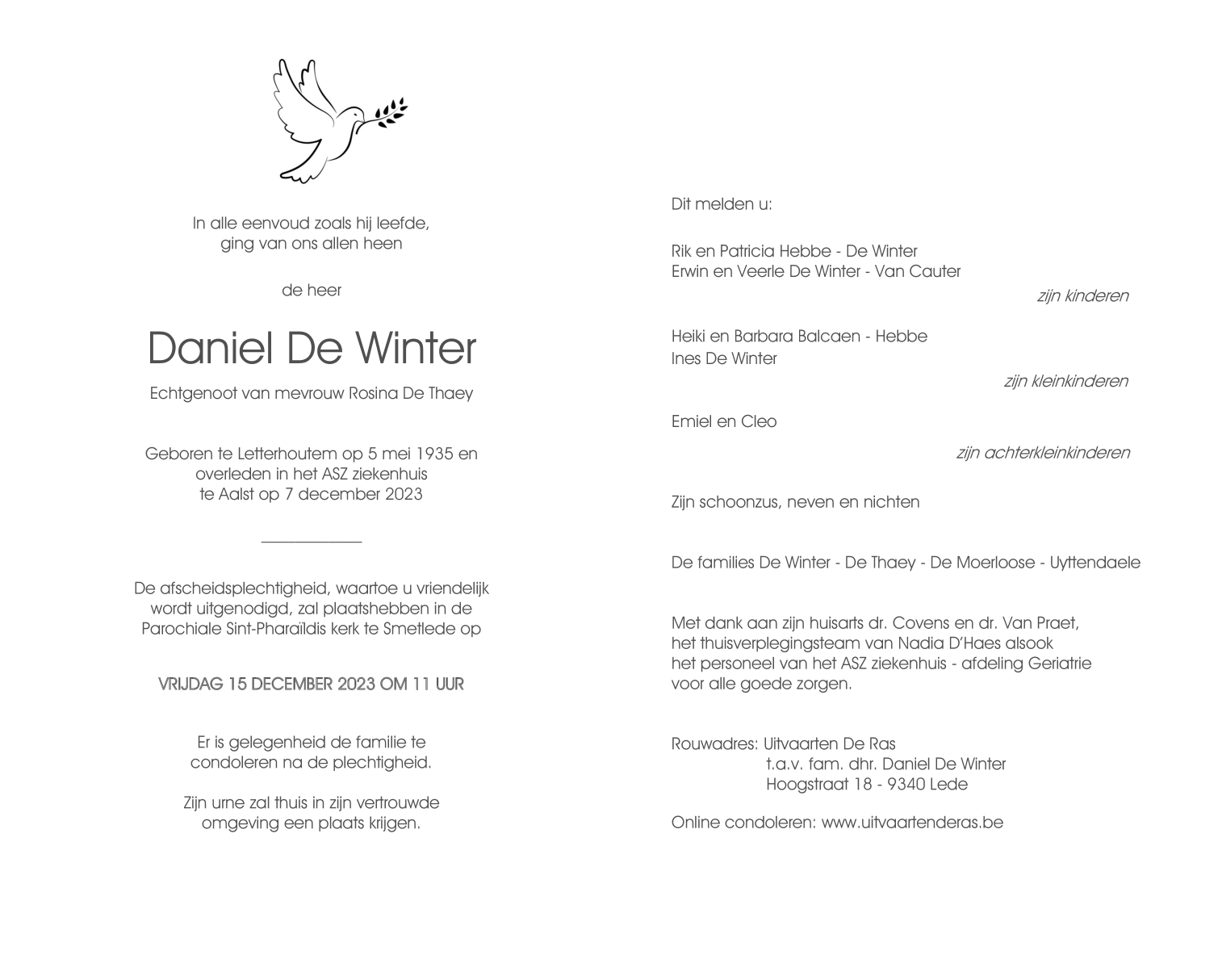 Overleden te Aalst (9300) op donderdag 7 december 2023 op 88-jarige leeftijd