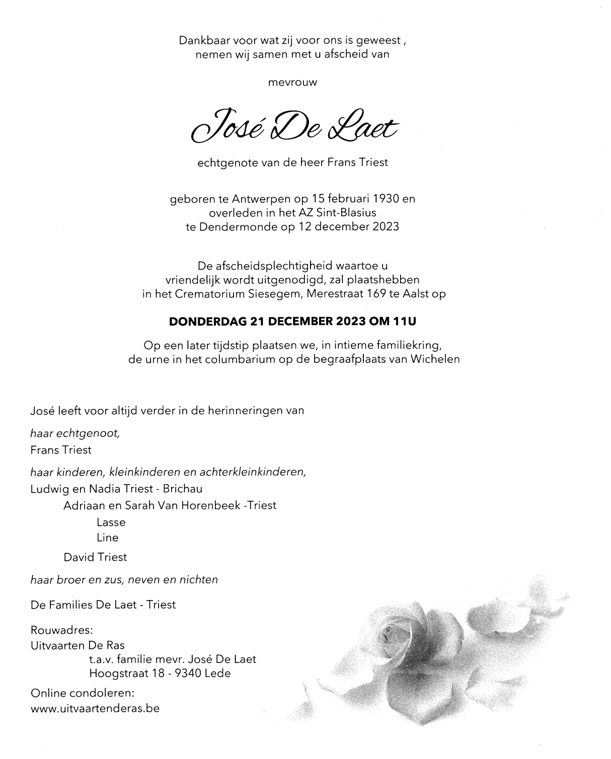 Overleden te Dendermonde (9200) op dinsdag 12 december 2023 op 93-jarige leeftijd