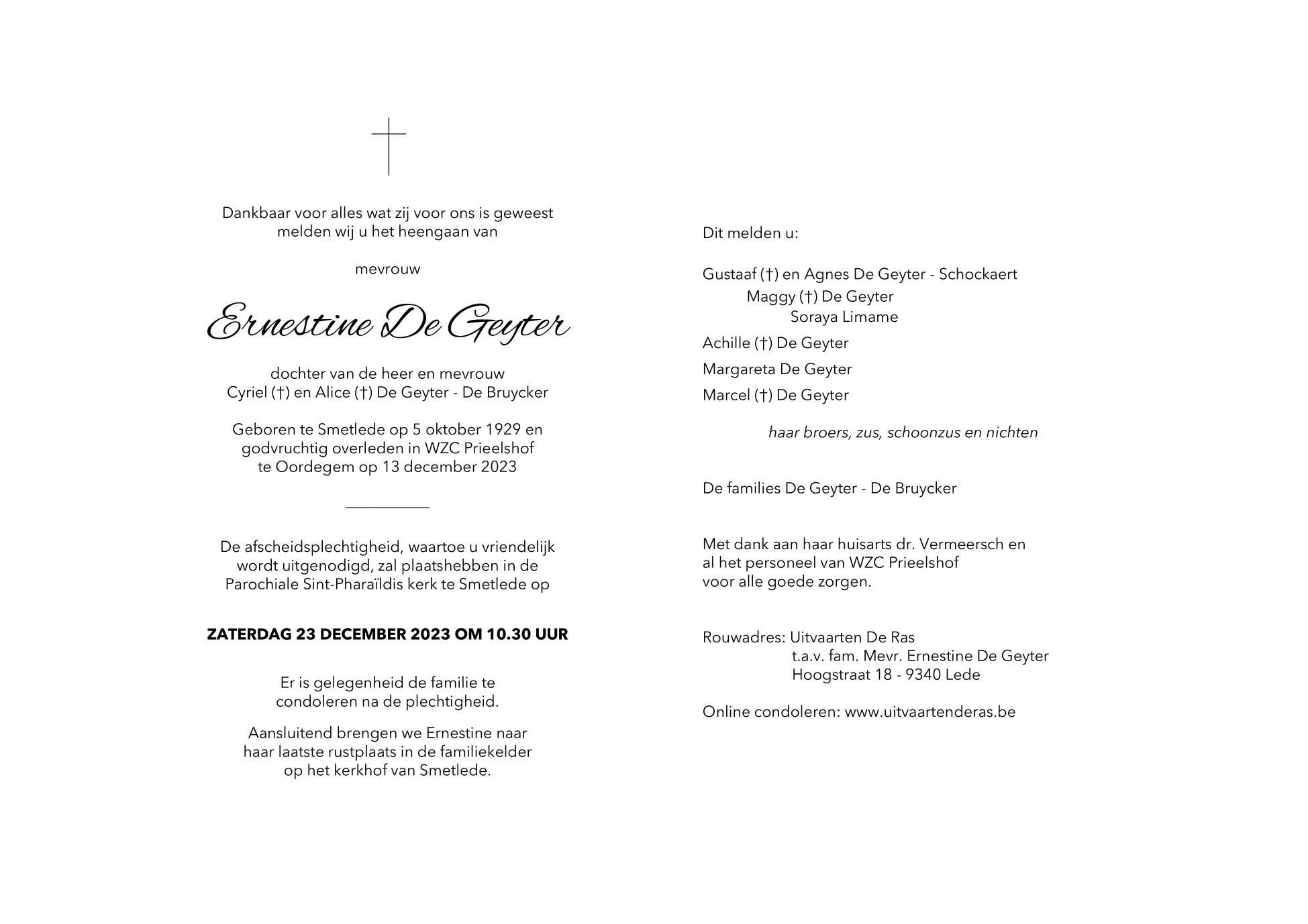 Overleden te Oordegem (9340) op woensdag 13 december 2023 op 94-jarige leeftijd