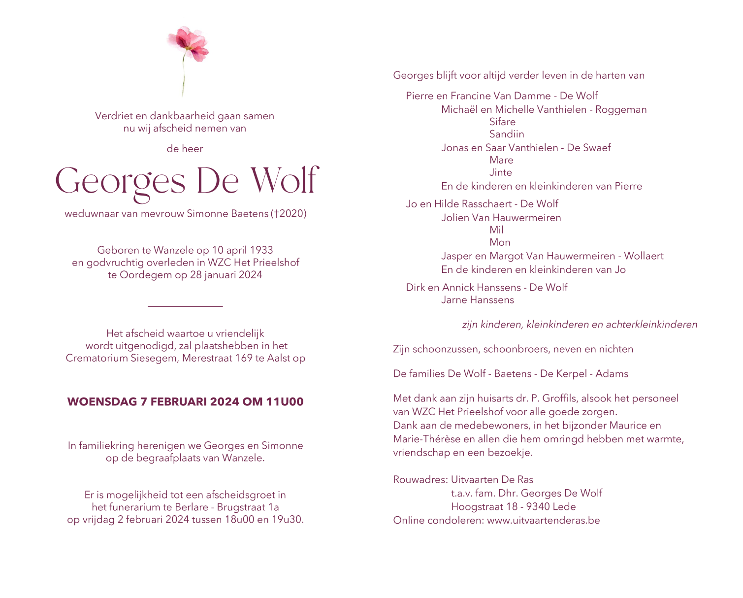 Overleden te Oordegem (9340) op zondag 28 januari 2024 op 90-jarige leeftijd