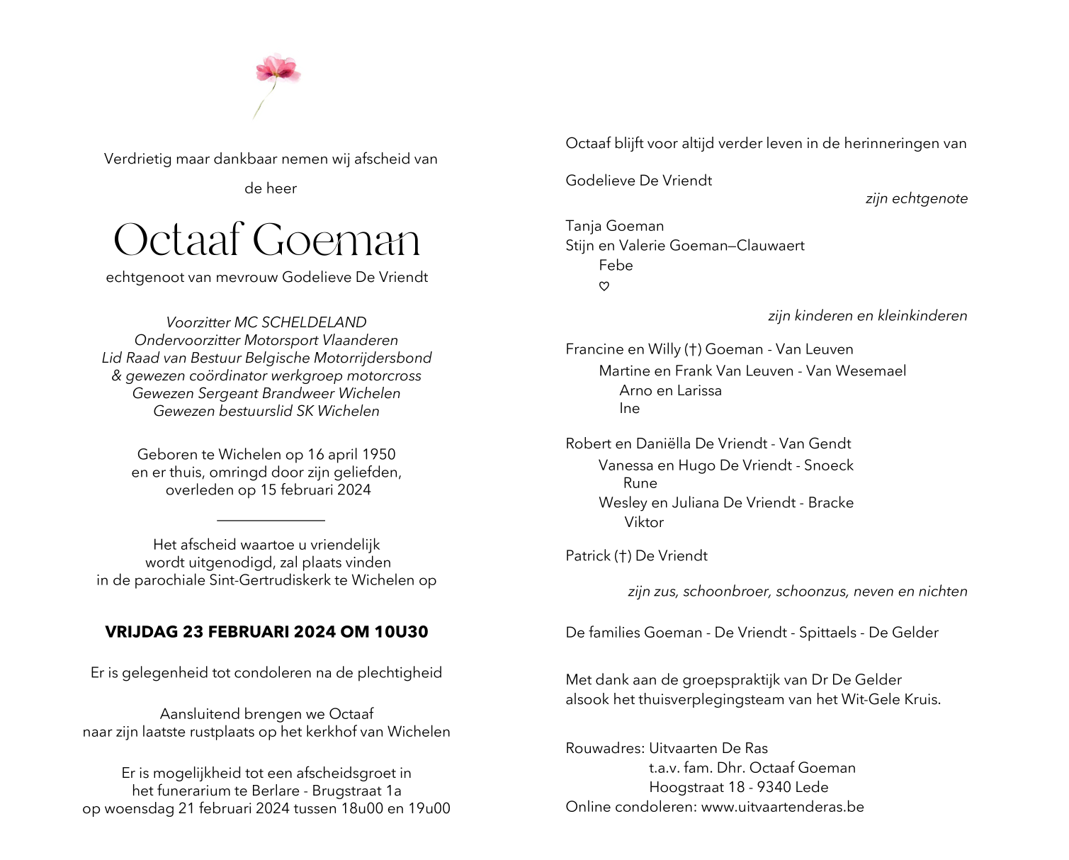 Overleden te Wichelen (9260) op donderdag 15 februari 2024 op 73-jarige leeftijd