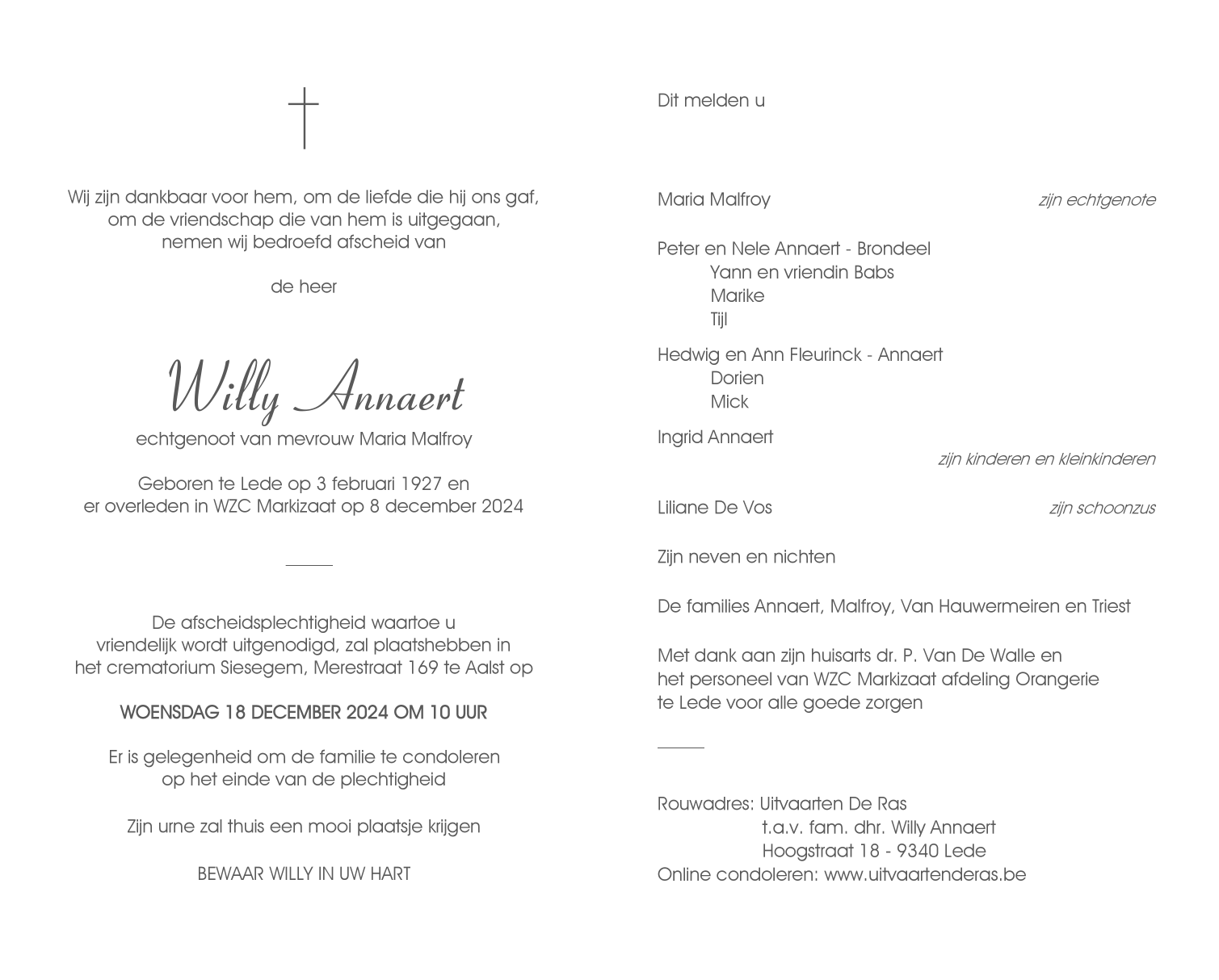 Overleden te Lede (9340) op zondag 8 december 2024 op 97-jarige leeftijd