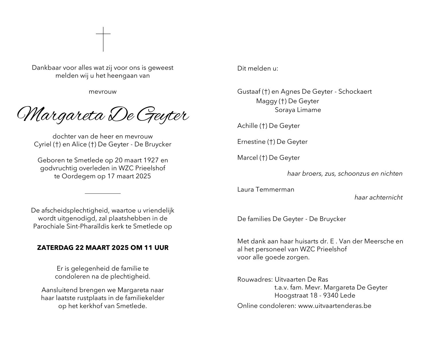 Overleden te Oordegem (9340) op maandag 17 maart 2025 op 97-jarige leeftijd