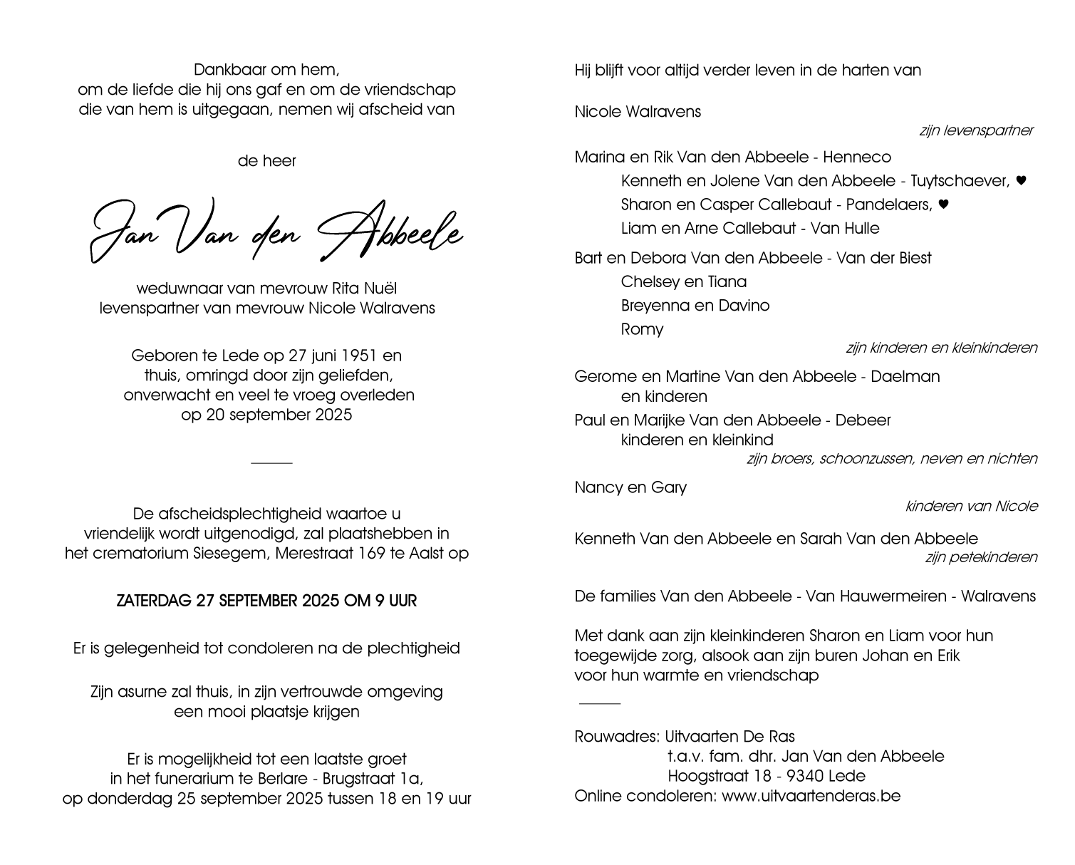 Overleden te Aalst (9300) op zaterdag 20 september 2025 op 74-jarige leeftijd