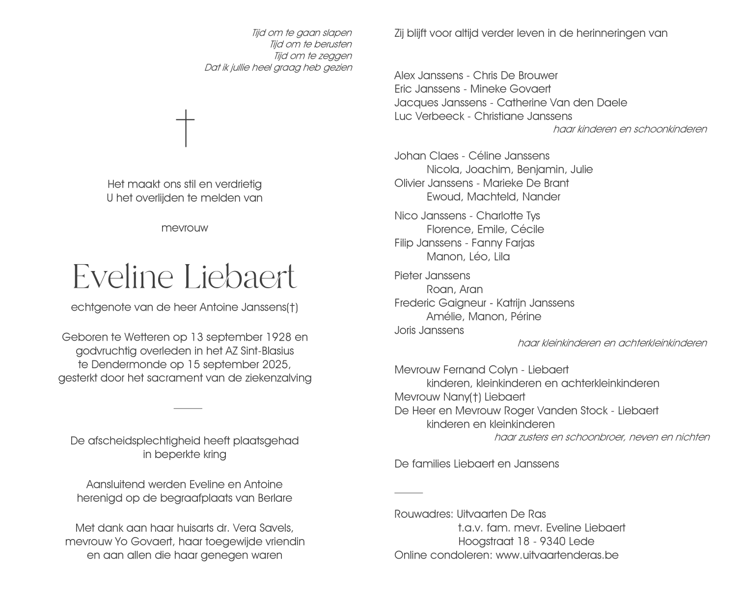 Overleden te Dendermonde (9200) op maandag 15 september 2025 op 97-jarige leeftijd