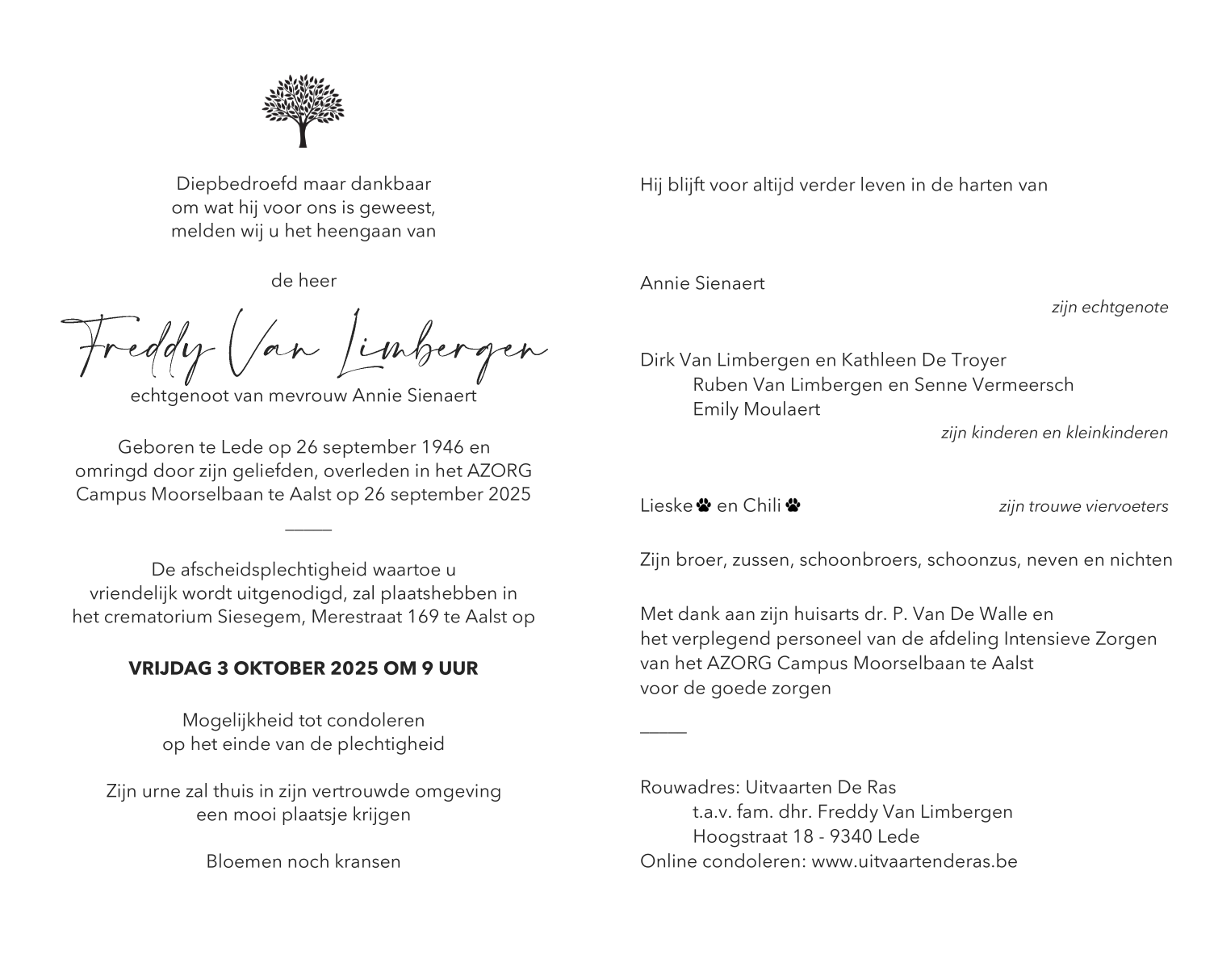 Overleden te Aalst (9300) op vrijdag 26 september 2025 op 79-jarige leeftijd