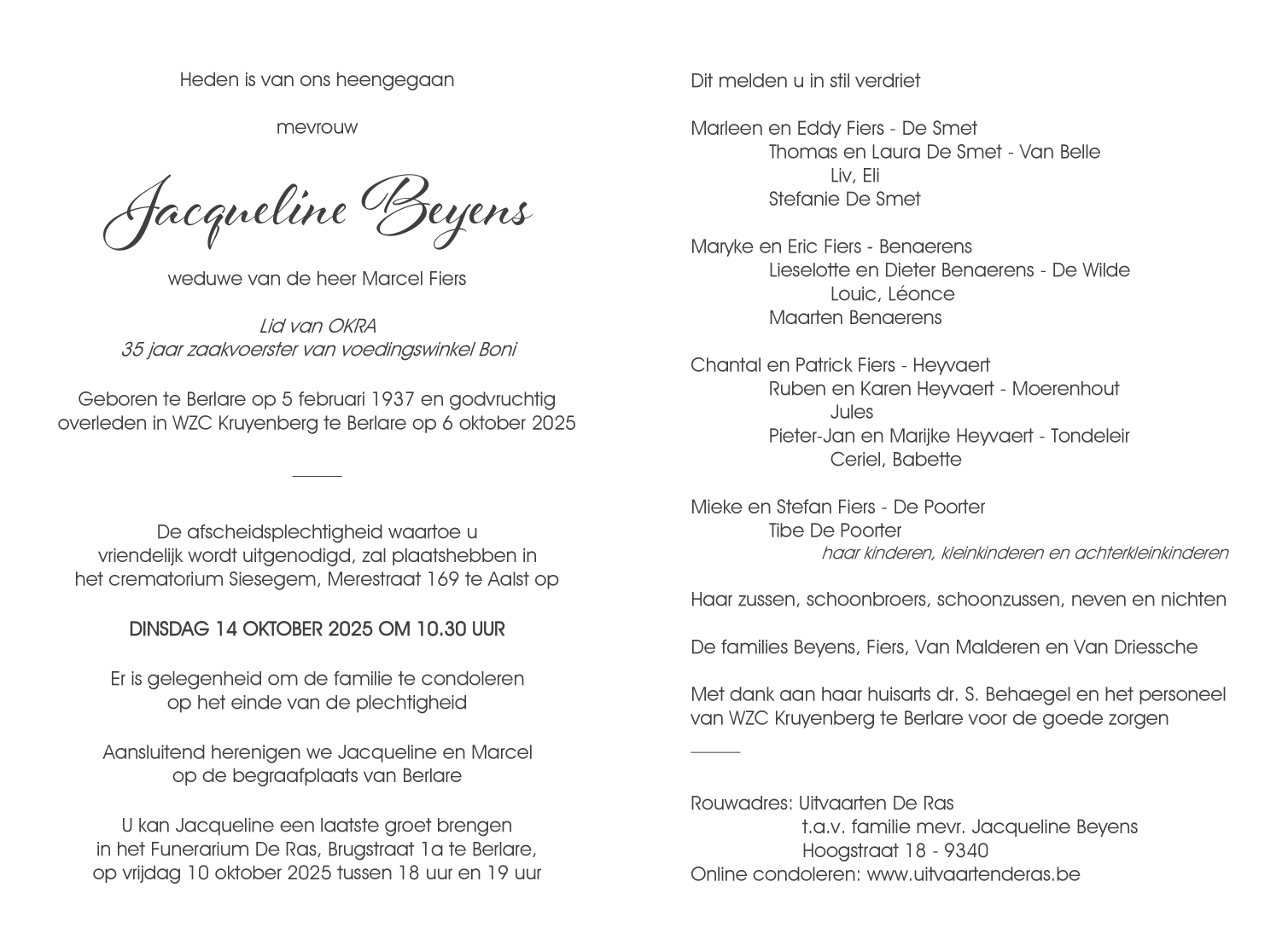 Overleden te Berlare (9290) op maandag 6 oktober 2025 op 88-jarige leeftijd