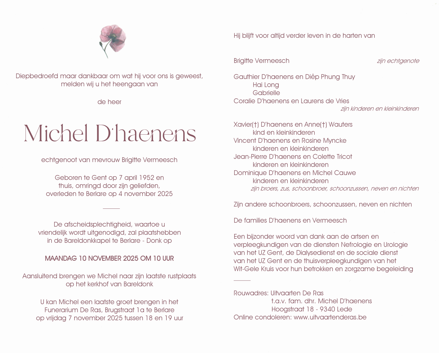 Overleden te Berlare (9290) op dinsdag 4 november 2025 op 73-jarige leeftijd