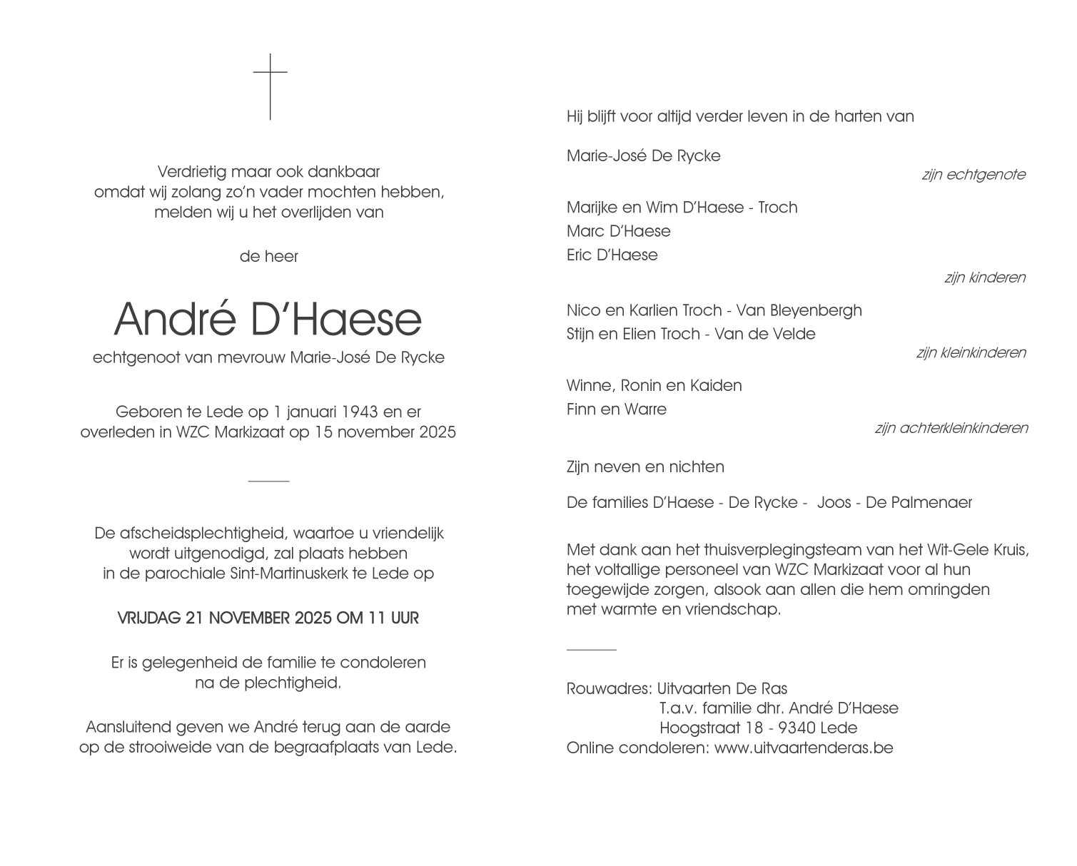 Overleden te Lede (9340) op zaterdag 15 november 2025 op 82-jarige leeftijd