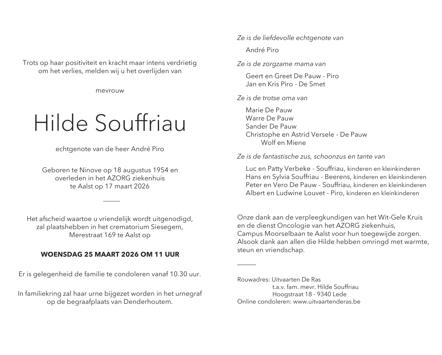 Overleden te Aalst (9300) op dinsdag 17 maart 2026 op 71-jarige leeftijd