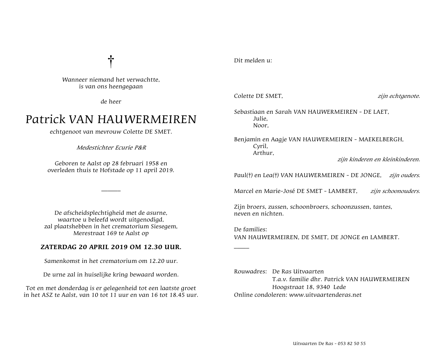 Overleden te Hofstade (O.-Vl.) (9308) op donderdag 11 april 2019 op 61-jarige leeftijd