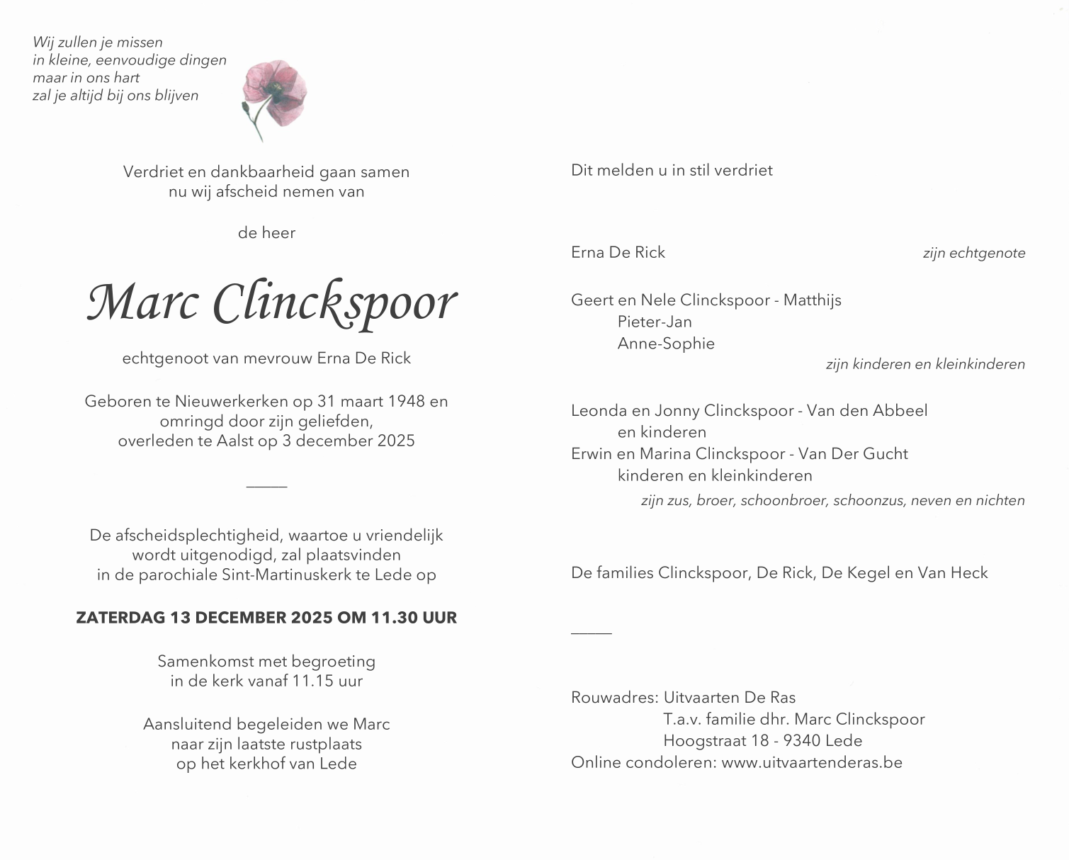 Overleden te Aalst (9300) op woensdag 3 december 2025 op 77-jarige leeftijd