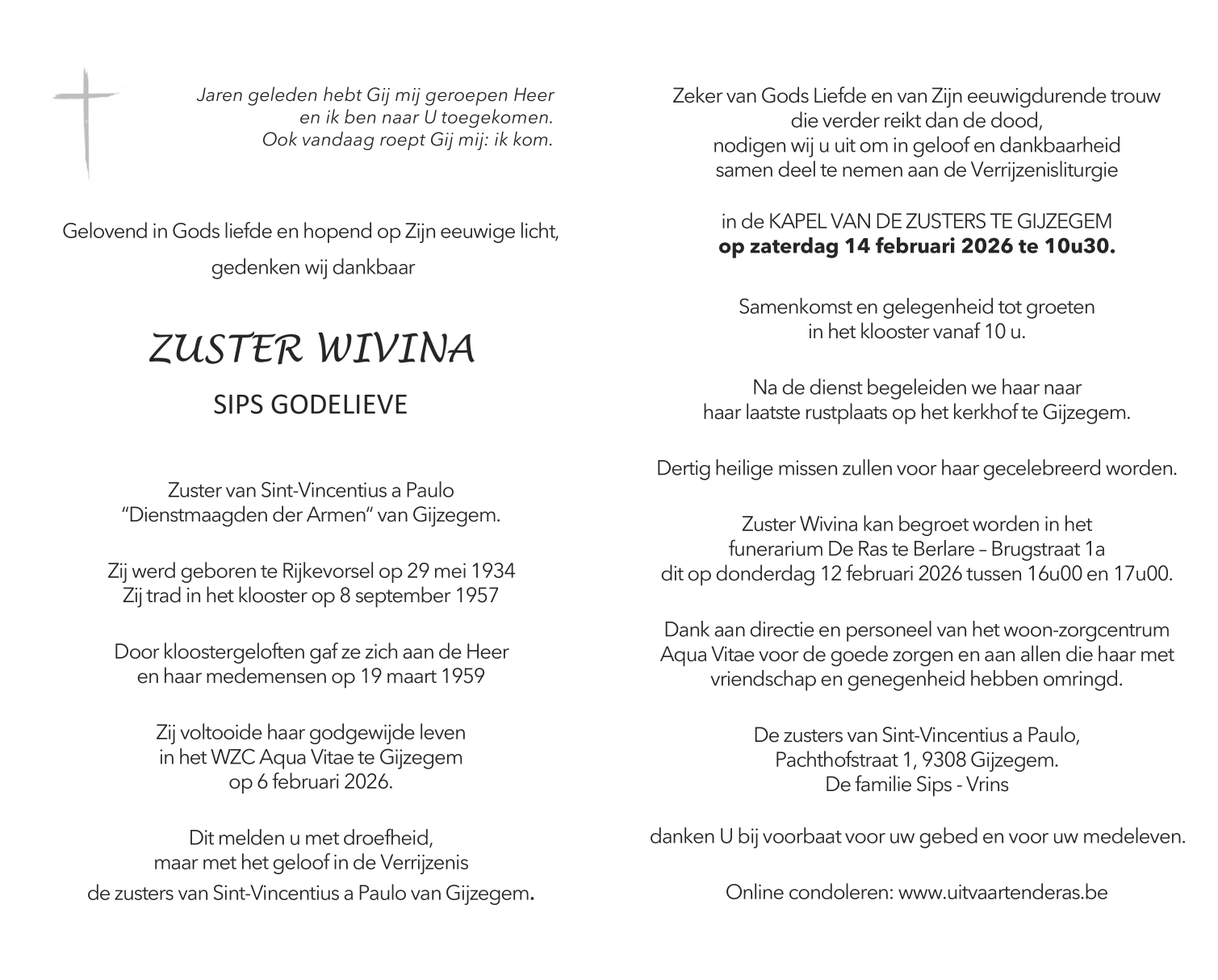 Overleden te Gijzegem (9308) op vrijdag 6 februari 2026 op 91-jarige leeftijd