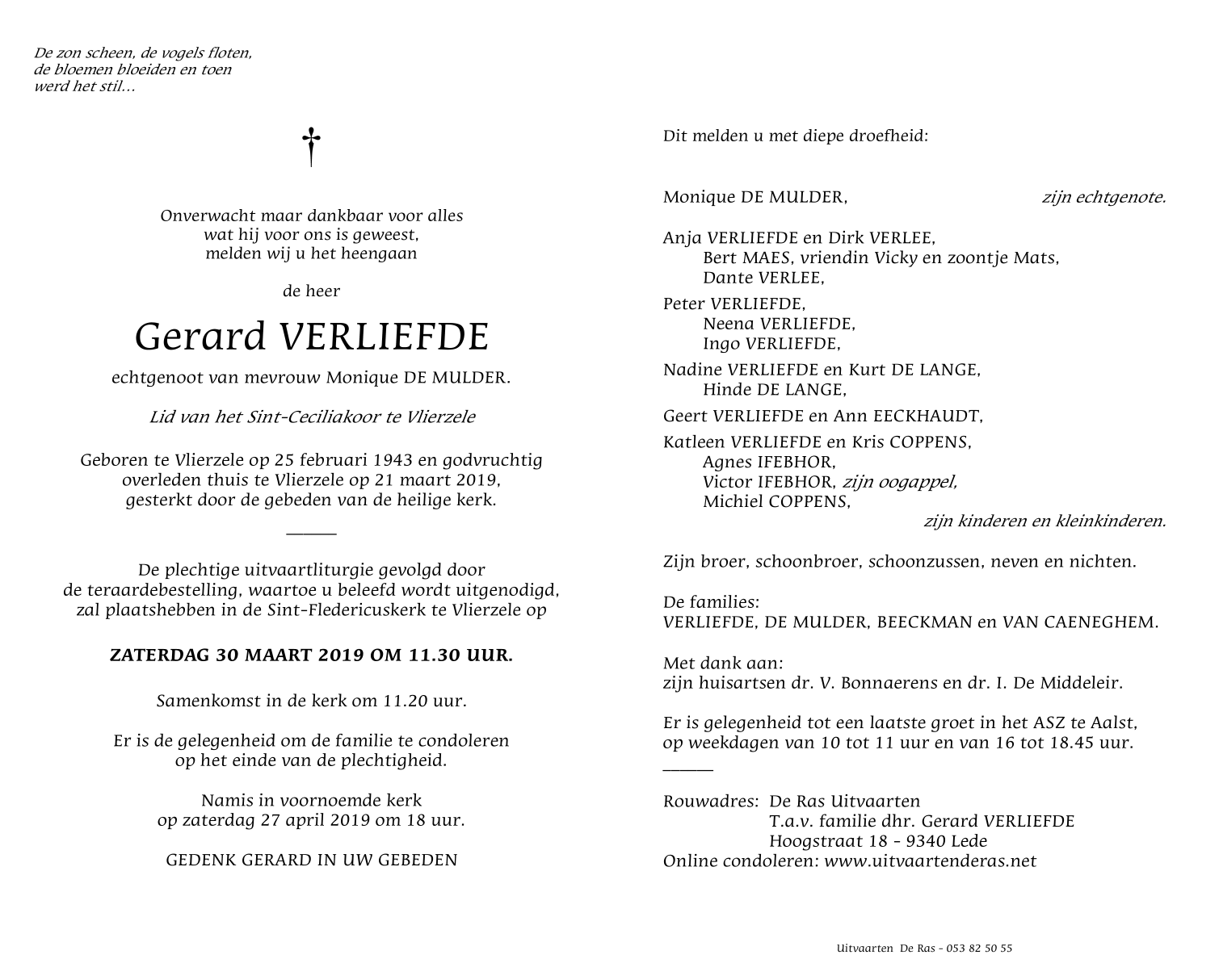 Overleden te Vlierzele (9520) op donderdag 21 maart 2019 op 76-jarige leeftijd