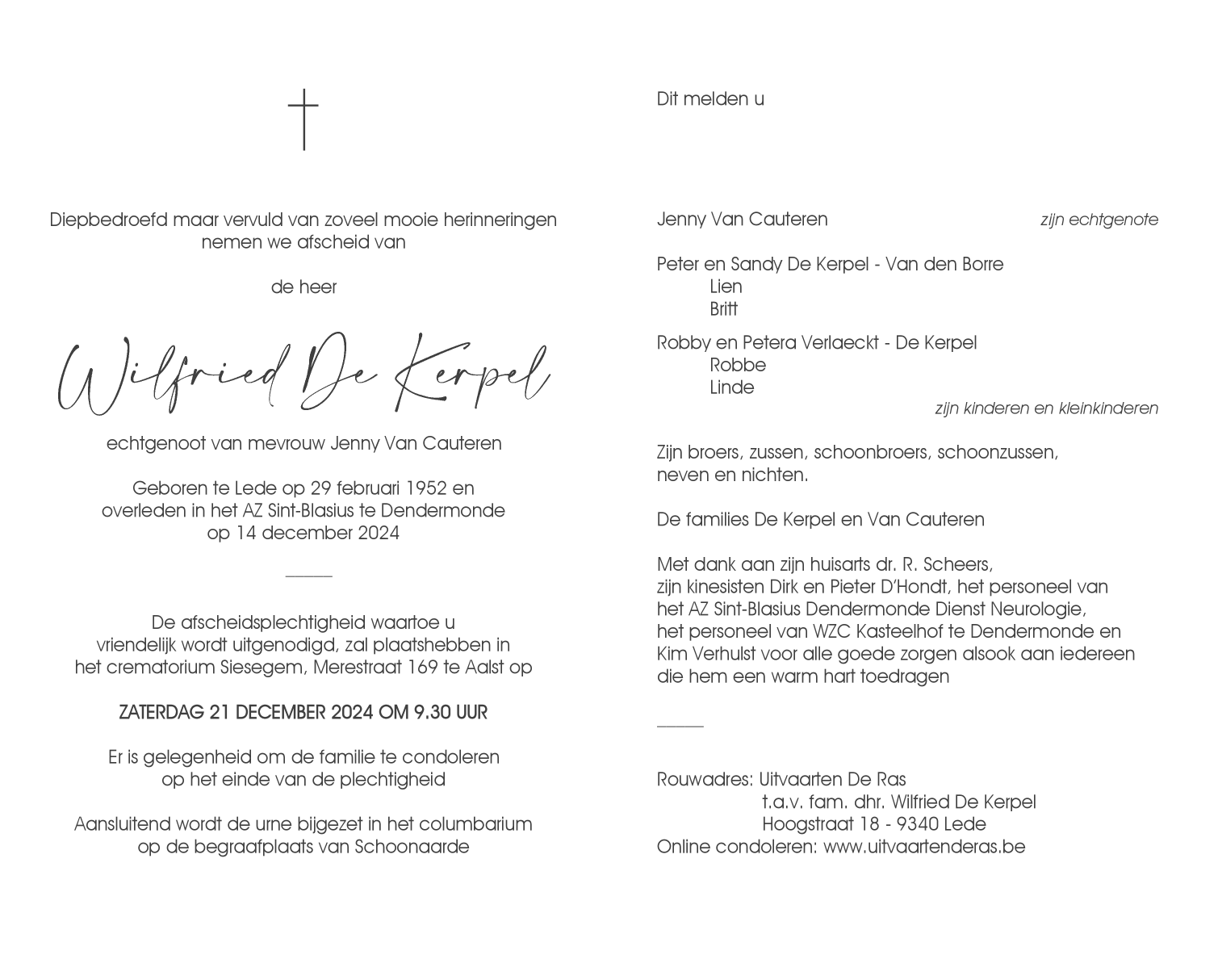 Overleden te Dendermonde (9200) op zaterdag 14 december 2024 op 72-jarige leeftijd
