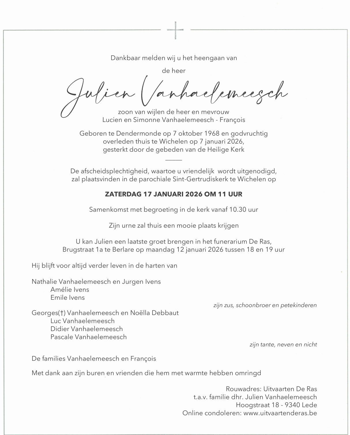 Overleden te Wichelen (9260) op woensdag 7 januari 2026 op 57-jarige leeftijd