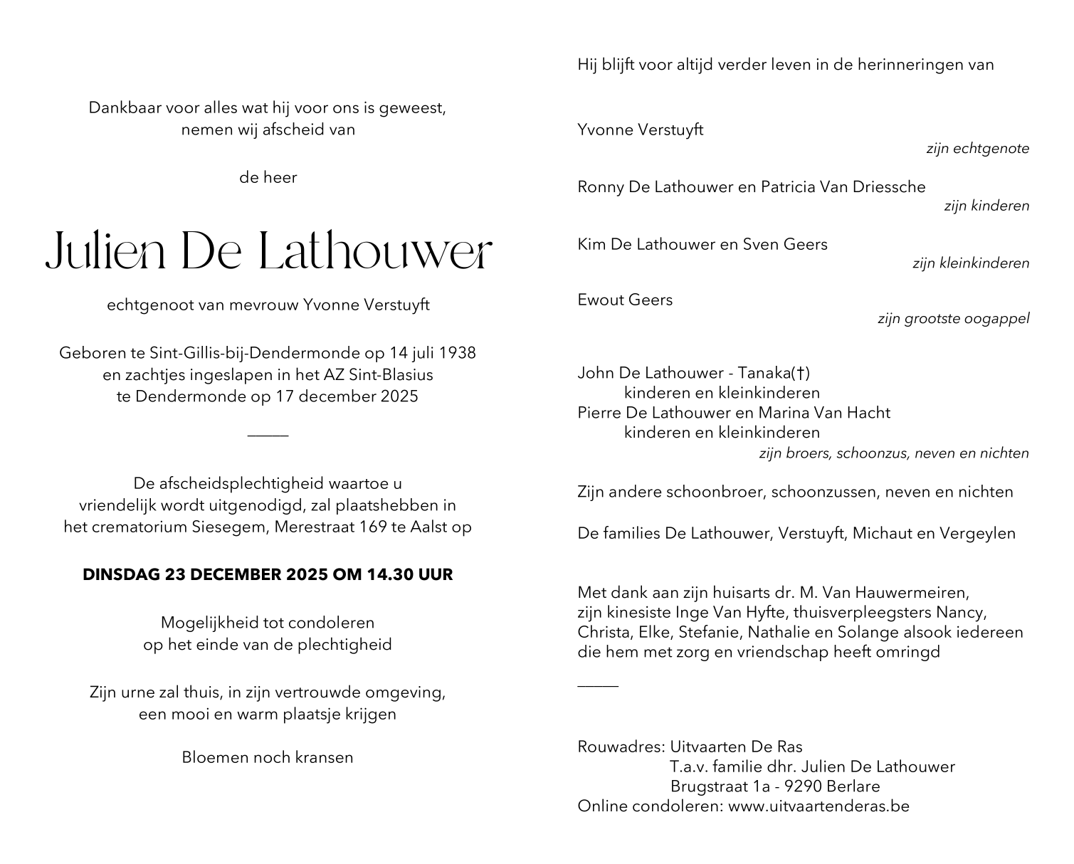 Overleden te Dendermonde (9200) op woensdag 17 december 2025 op 87-jarige leeftijd