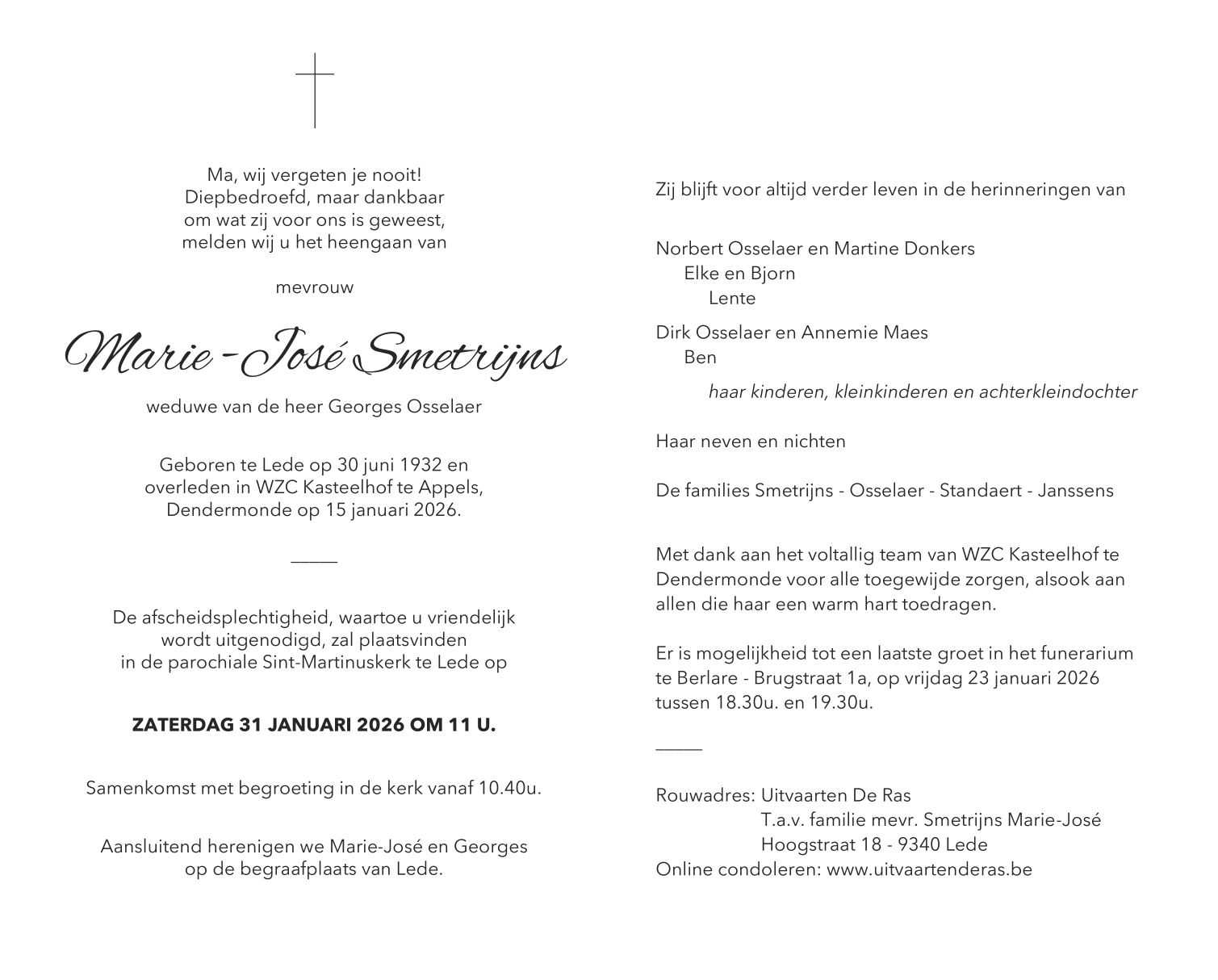 Overleden te Appels (9200) op donderdag 15 januari 2026 op 93-jarige leeftijd
