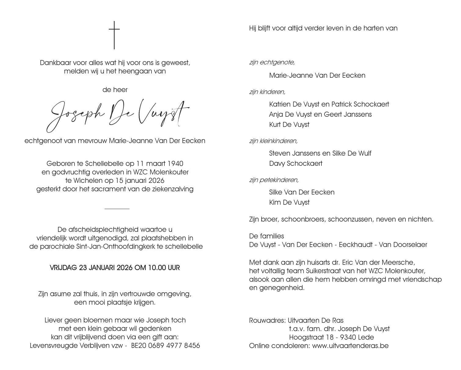 Overleden te Wichelen (9260) op donderdag 15 januari 2026 op 85-jarige leeftijd
