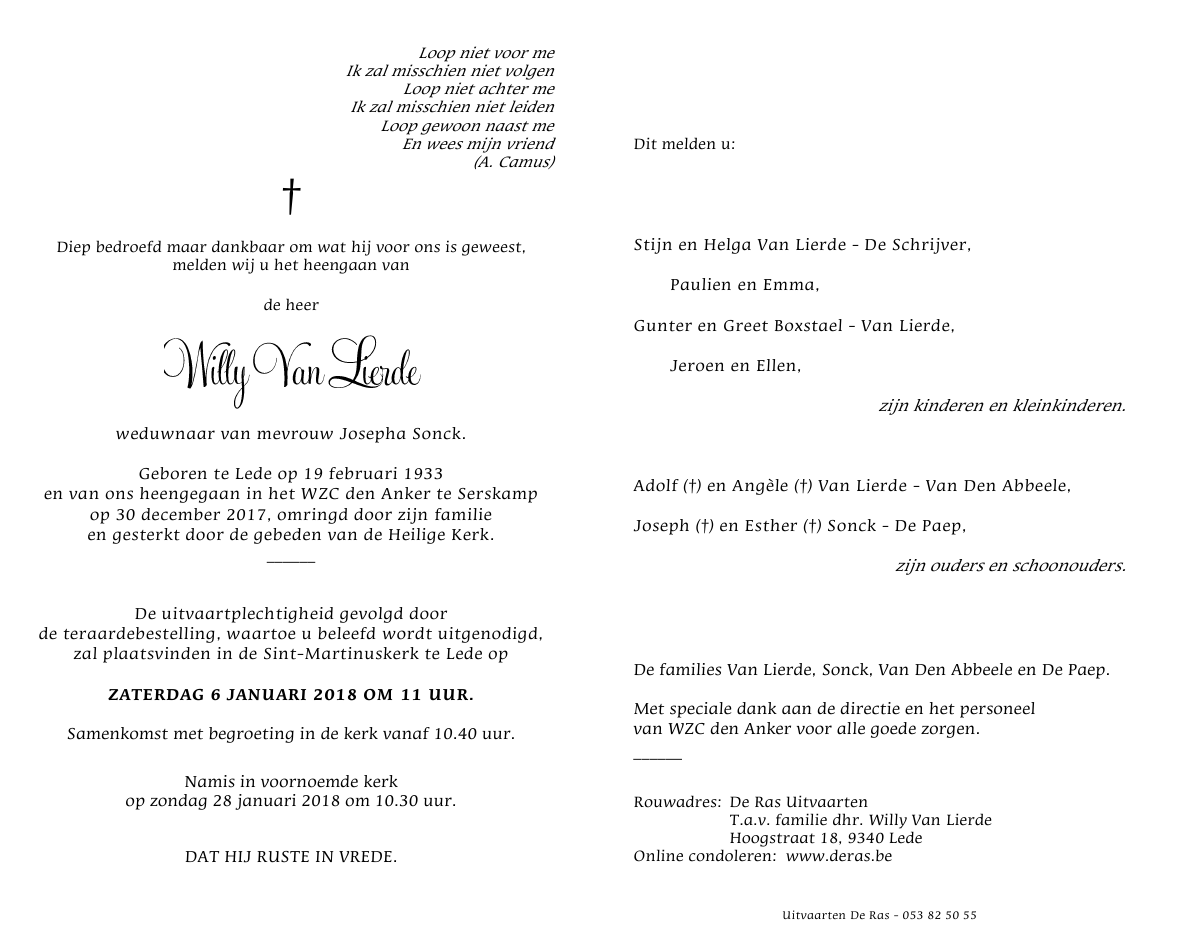 Overleden te Serskamp (9260) op zaterdag 30 december 2017 op 84-jarige leeftijd