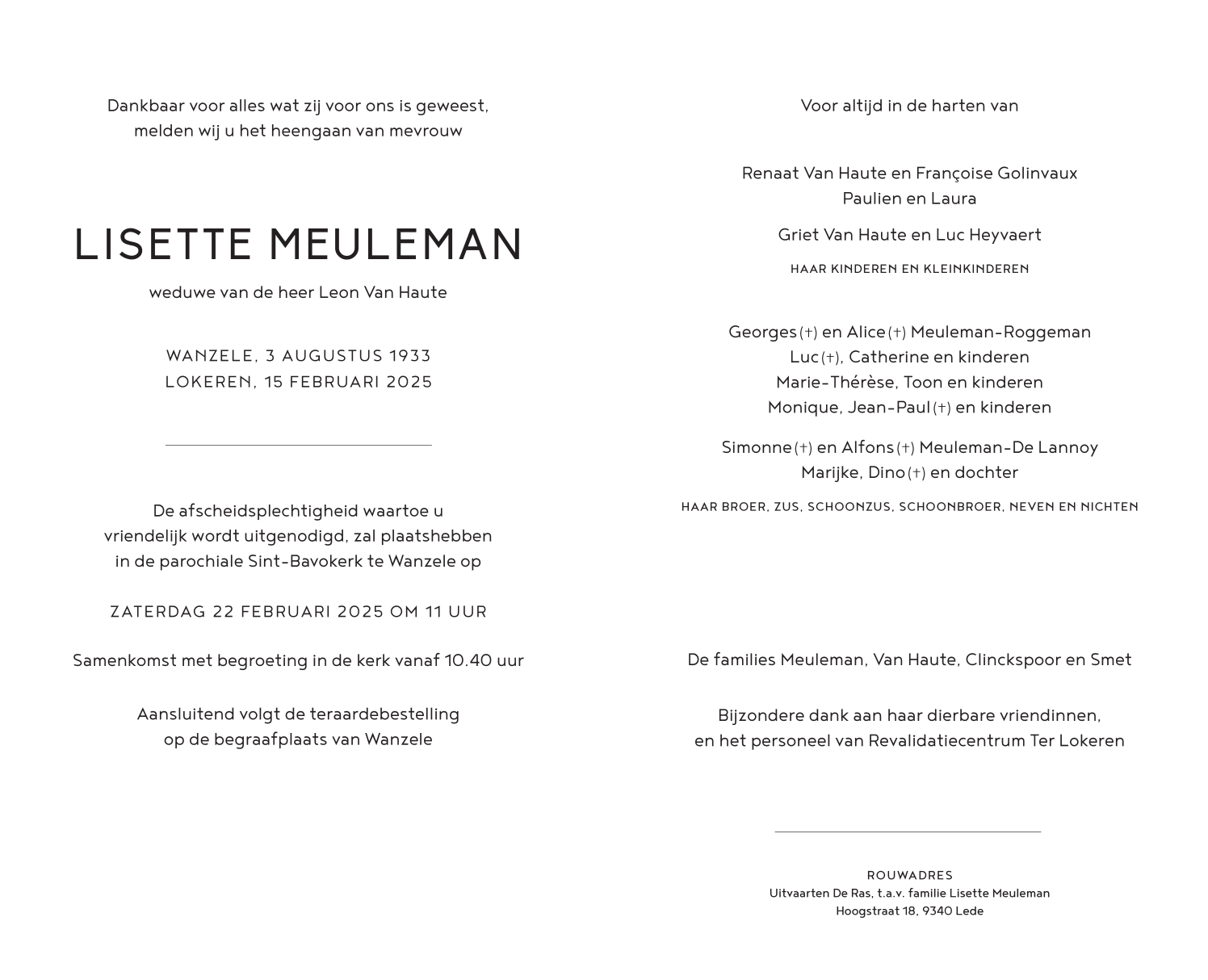 Overleden te Lokeren (9160) op zaterdag 15 februari 2025 op 91-jarige leeftijd