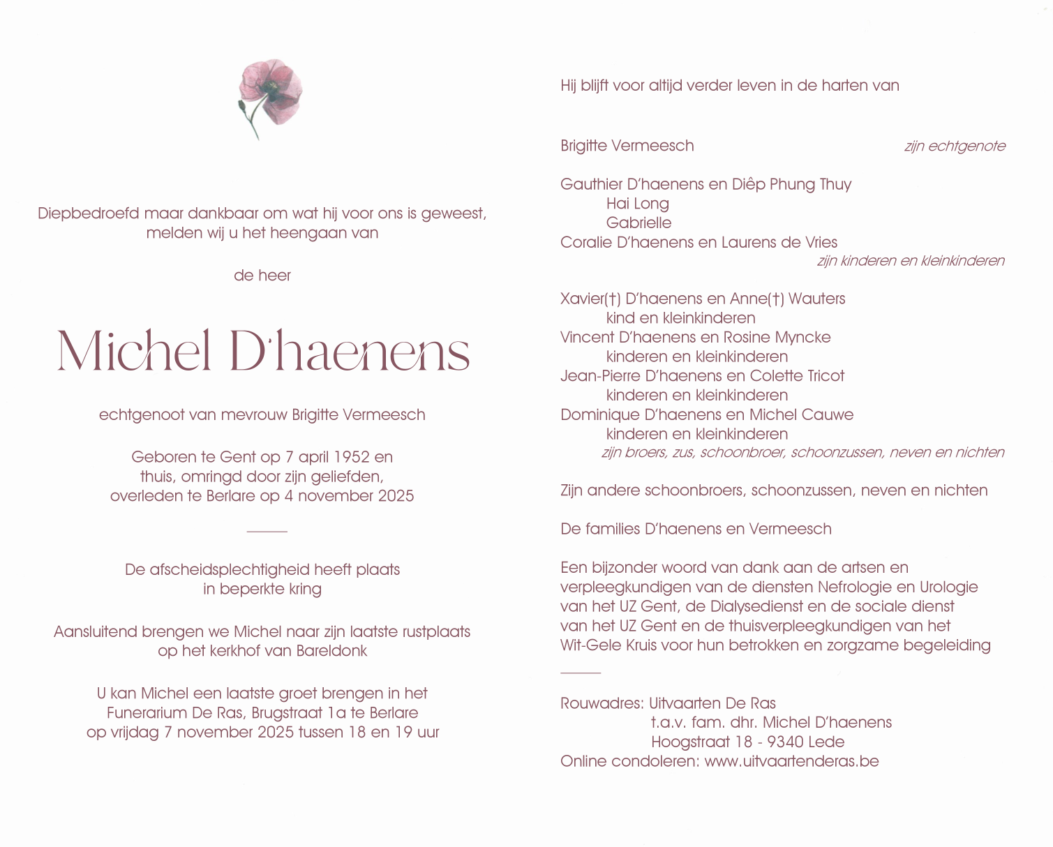 Overleden te Berlare (9290) op dinsdag 4 november 2025 op 73-jarige leeftijd