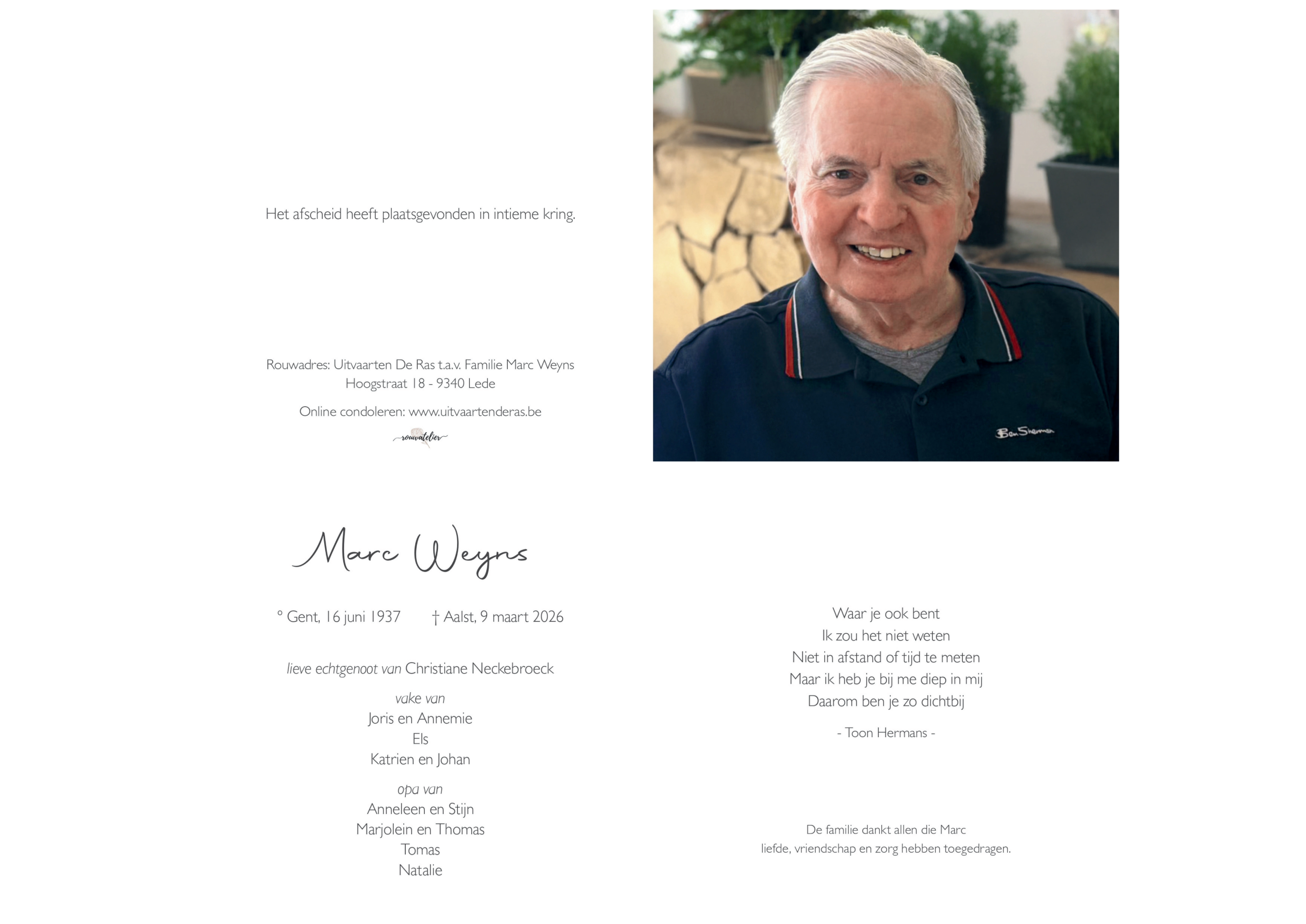 Overleden te Aalst (9300) op maandag 16 maart 2026 op 88-jarige leeftijd