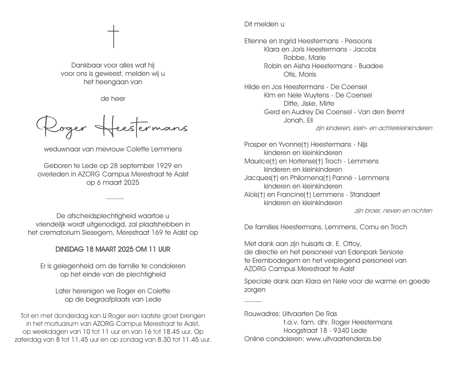 Overleden te Aalst (9300) op donderdag 6 maart 2025 op 95-jarige leeftijd