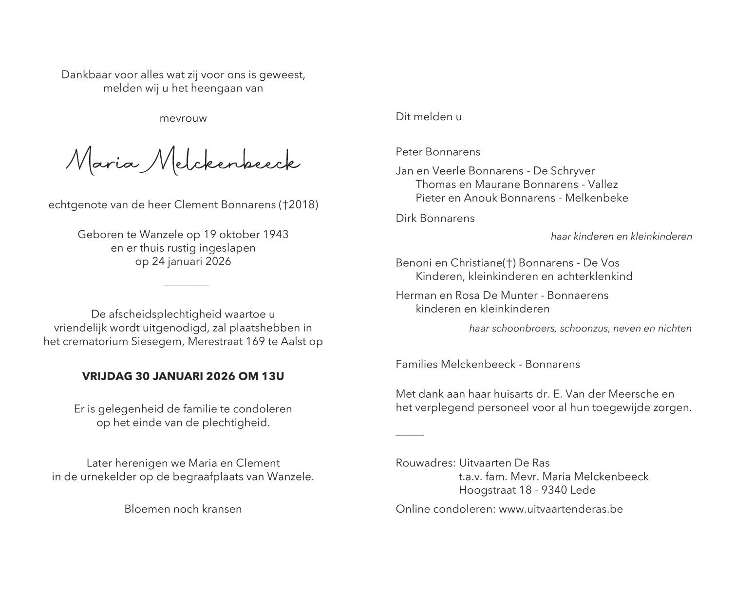 Overleden te Wanzele (9340) op zaterdag 24 januari 2026 op 82-jarige leeftijd