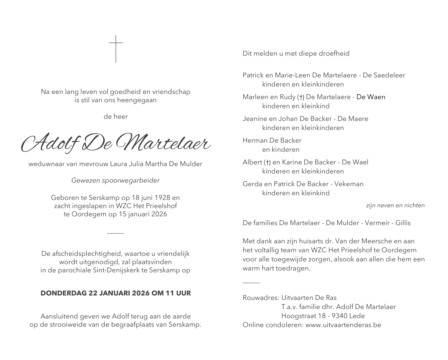 Overleden te Oordegem (9340) op donderdag 15 januari 2026 op 97-jarige leeftijd