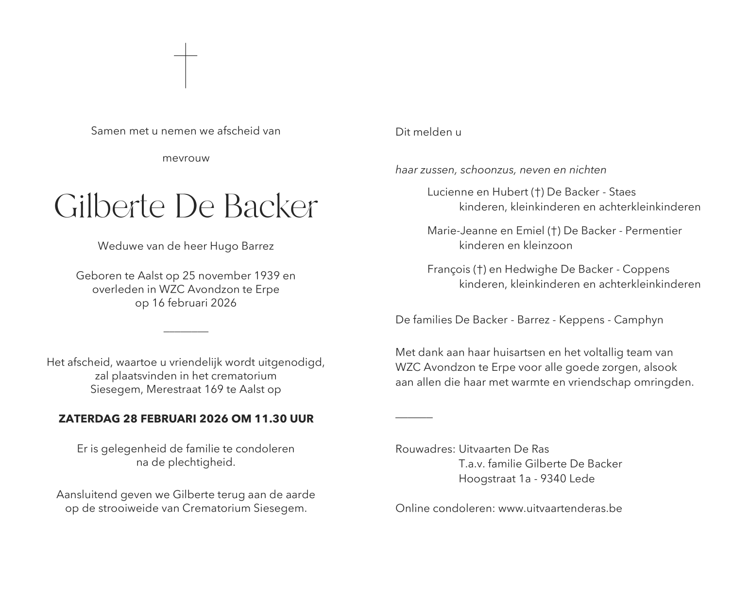 Overleden te Erpe (9420) op maandag 16 februari 2026 op 86-jarige leeftijd