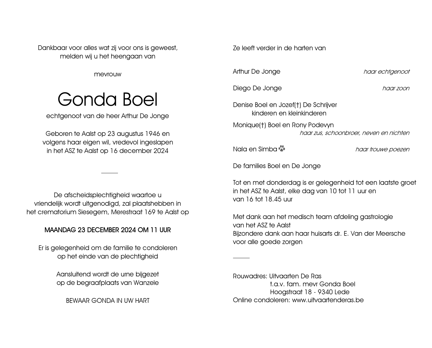 Overleden te Aalst (9300) op maandag 16 december 2024 op 78-jarige leeftijd